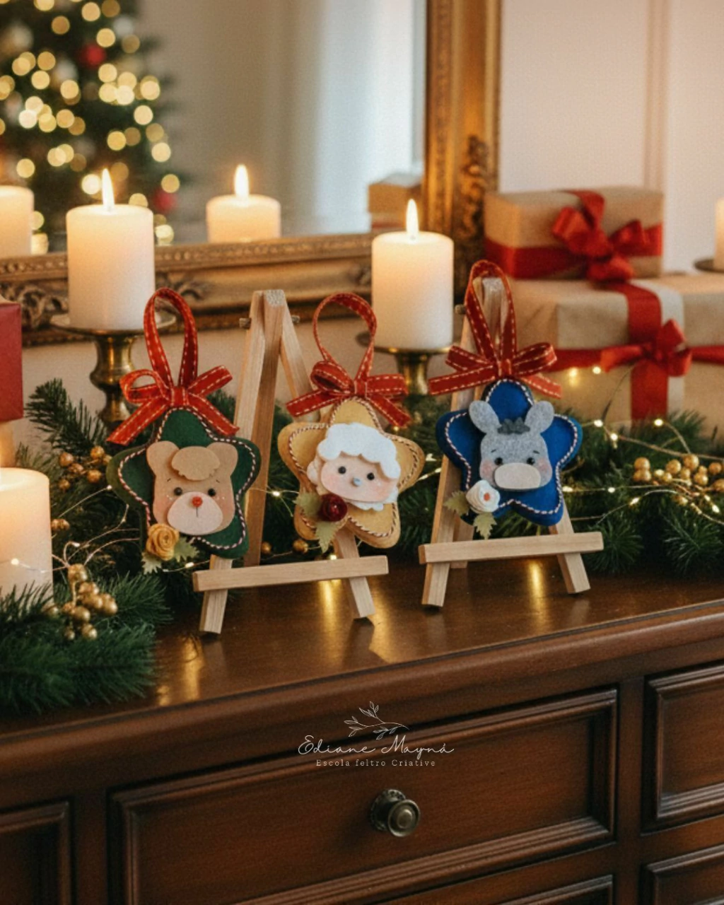 Neste curso, você terá acesso ao molde em PDF e vídeo aula na plataforma da escola para confeccionar três lindos pingentes de 9 cm cada: a Ovelha, o Burrinho e o Camelo. São peças delicadas e perfeitas para dar um toque especial à sua decoração natalina! Observação importante: Detalhes como folhas e outras partes que não podem ser cortadas à mão não fazem parte do PDF. O foco são os moldes principais para a confecção dos animais. ✂️
